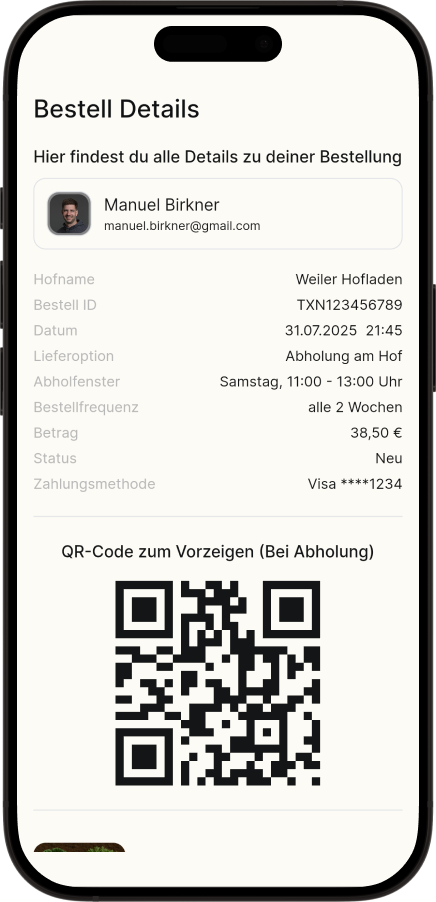 Hof/Produkte auswählen → in den Warenkorb → Apple/Google Pay oder Karte → Abhol-Zeitfenster wählen. Du erhältst Bestellbestätigung & Beleg in der App (auf Wunsch auch per E-Mail).